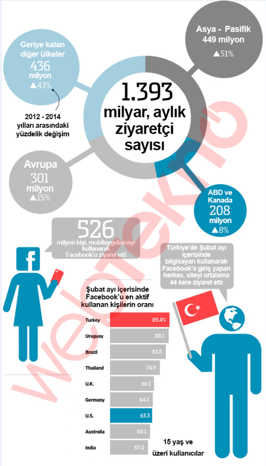 Facebook’un son zamanlarda ki yüksek üye çekimi sebebiyle artık bir ülke oluşturabilecek kadar kullanıcıya sahip olduğunu biliyoruz. 2014 yılının son çeyreğine doğru 1,4 milyar üye olduğunu ve bunların 1,1 milyarının aktif olarak Facebook’u ziyaret ettiğini duyuran Mark Zuckerberg, “2015 yılının ilk çeyreğinde en aktif olan ülkeyi Türkiye” olarak belirledi.